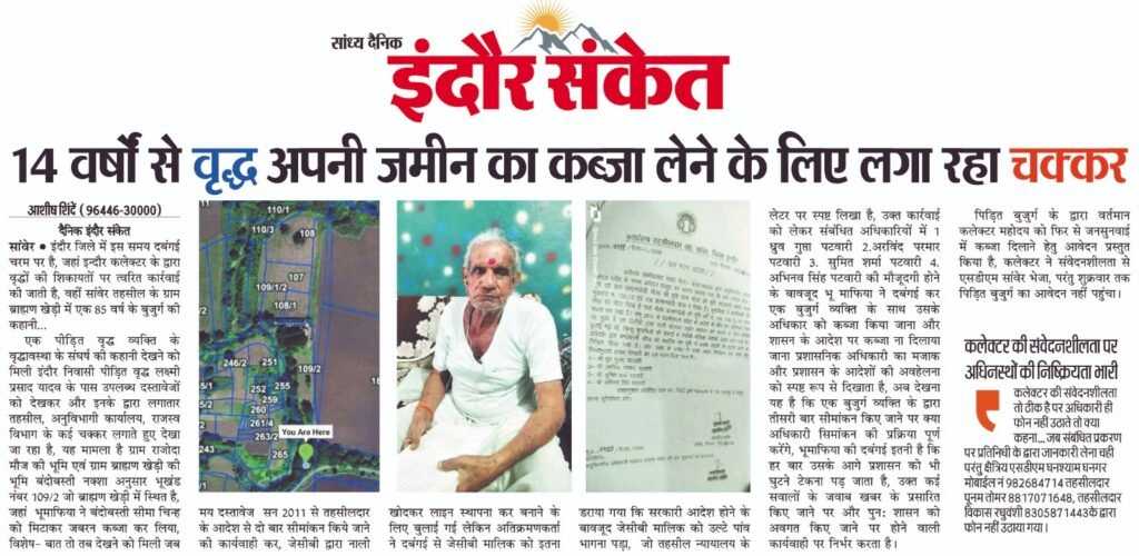 सांवेर! इन्दौर जिले में इस समय दबंगई चरम पर है, जहां इन्दौर कलेक्टर महोदय के द्वारा वृद्धों की शिकायतों पर त्वरित कार्रवाई की जाती है, वहीं सांवेर तहसील के ग्राम ब्राह्मण खेड़ी में एक 85 वर्ष के बुजुर्ग की कहानी…