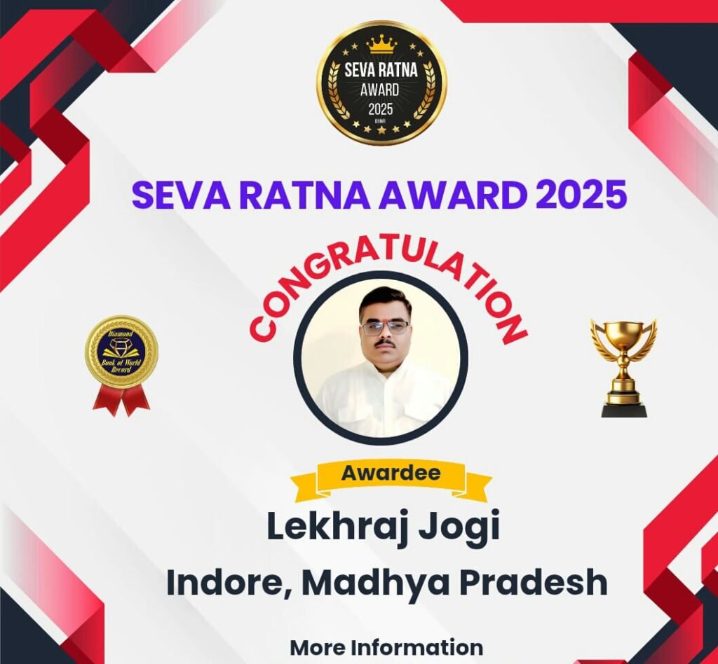 अखिल भारत वर्षीय नाथ समाज के प्रदेश महासचिव राष्ट्रीय पत्रकार संघ भारत के जिला अध्यक्ष लेखराज जोगी जी को निरन्तर समाज हित मे सार्थक प्रयास करते है आप जैसे समाज सेवी बड़ी मुश्किल से मिलते है जो समाज के विकास पर हमेशा आगे रहते है यह सम्मान पत्र आपकी मेहनत और लगन गुरु गोरख नाथ महाराज की कृपा से आज मिला है आगे भी बहुत से सम्मान होगे सेवा रतन से सम्मानित होने पर समाज को गौरवान्वित किया है आपका विजय नाथ प्रदेश संगठन मंत्री अखिल भारत वर्षीय नाथ समाज