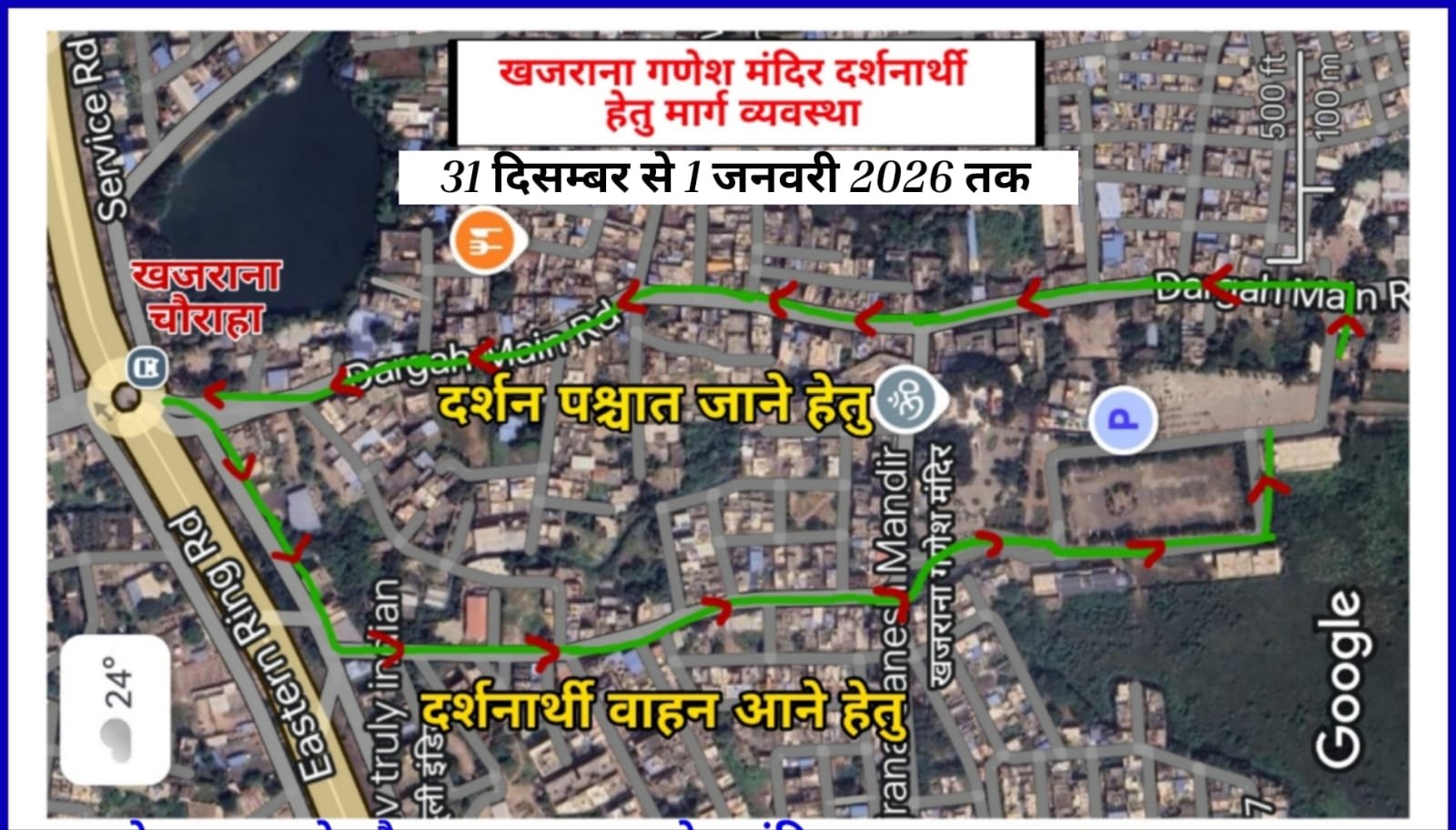 इंदौर के प्रसिद्ध धार्मिक स्थल खजराना गणेश मंदिर में नव वर्ष पर लाखों भक्त दर्शन के लिए पहुँचेंगे इसे ध्यान में रखते हुए दिनाँक 31 दिसम्बर 2025 से 1 जनवरी 2026 तक आमजन मानस के सुगम यातायात हेतु यातायात प्रबंधन पुलिस द्वारा रूट प्लान तैयार किया गया है-