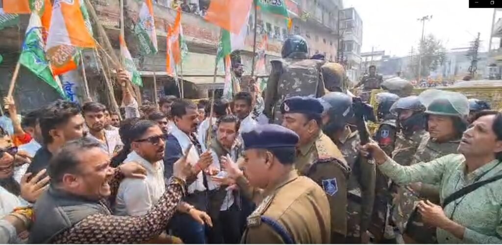 - बीजेपी के कार्यकर्ता भगवा झंडे लहराते हुए नारेबाज़ी कर रहे थे।